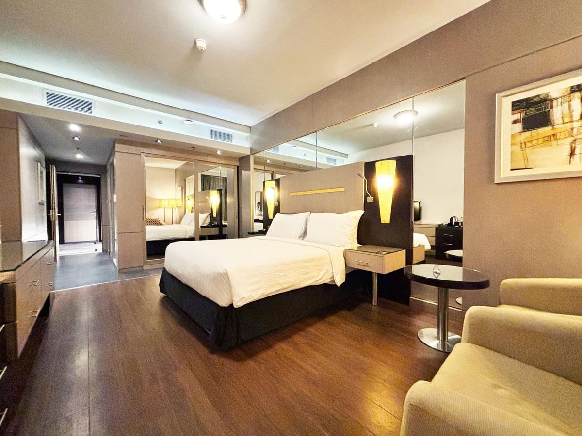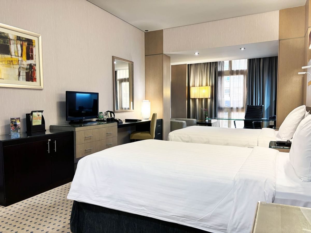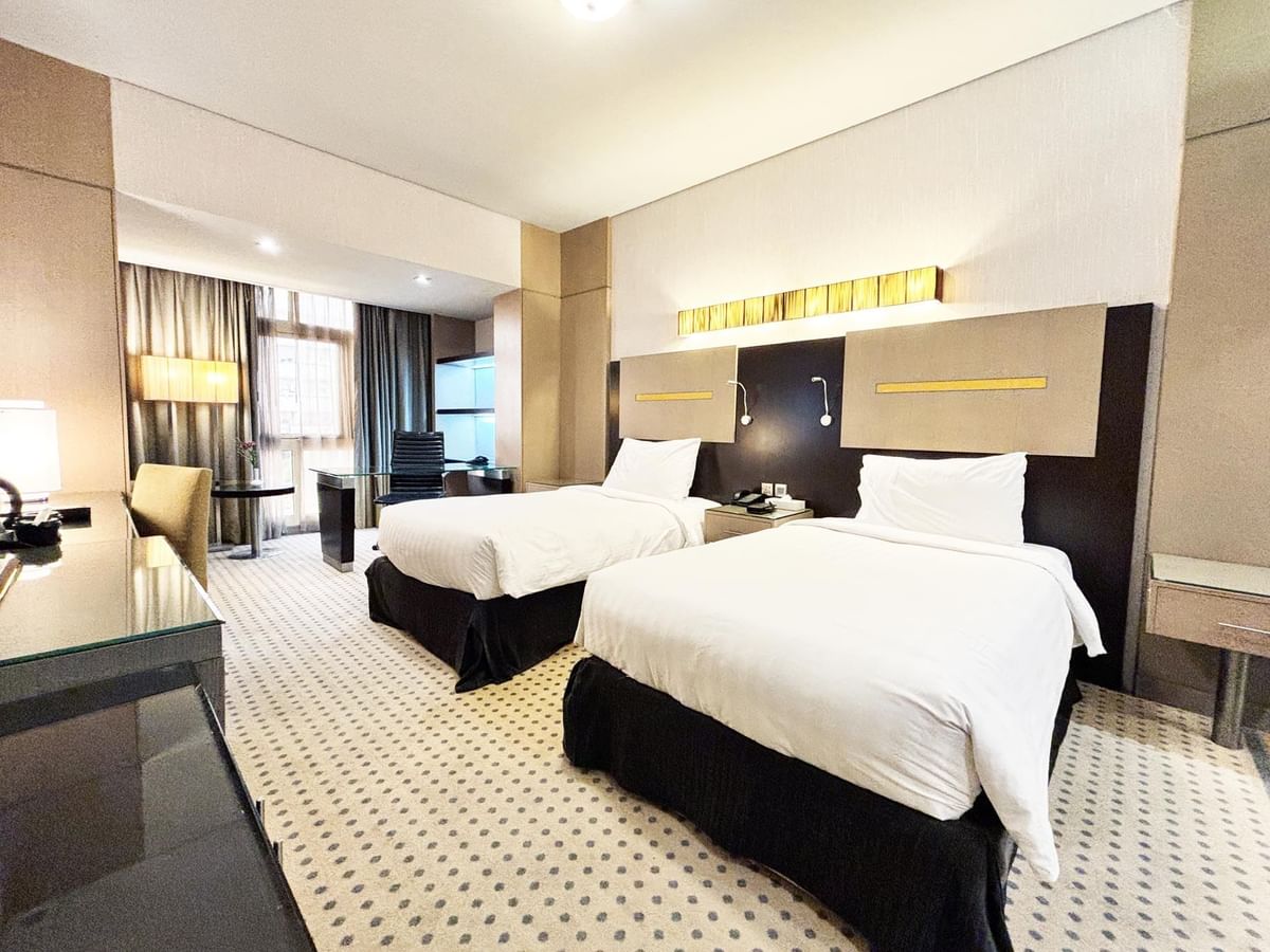 Executive Room features premium quality twin beds, with views of the city or hotel atrium, working desk and a minibar with non-alcoholic beverages.