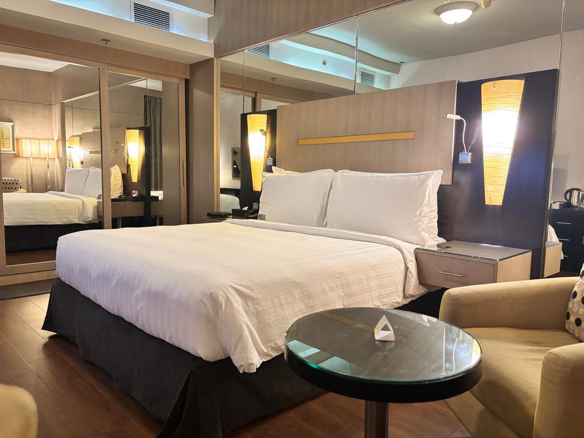 Executive Room features a king bed with the view of Dubai or hotel atrium, private balcony, working desk and a minibar with non-alcoholic beverages.