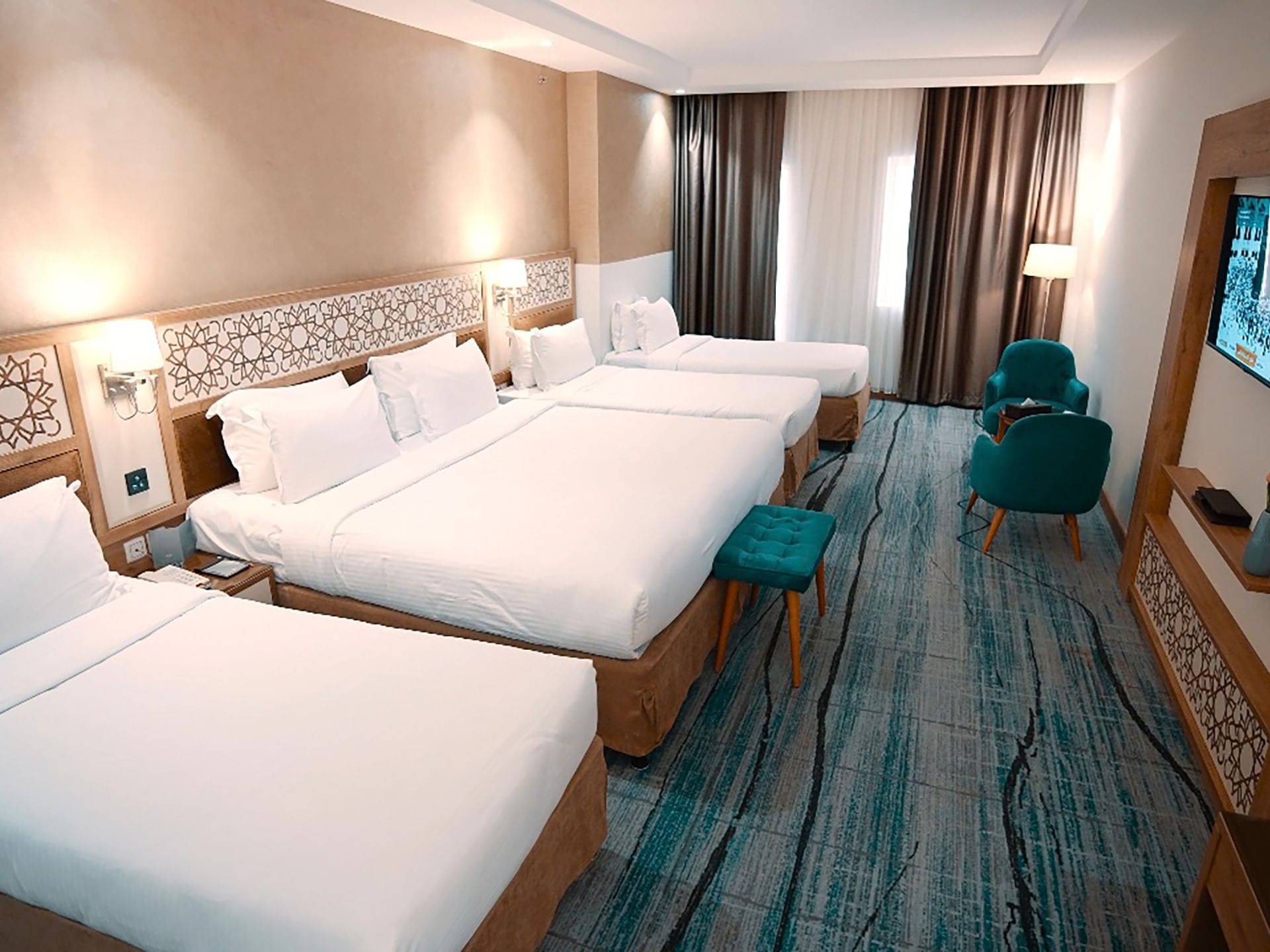 Welcome to TIME Ruba Hotel & Suites, where luxury meets comfort in our offering of 770 well-appointed rooms in Makkah. Among them, we present 461 Deluxe Quadruple rooms, 35 Deluxe Triplet rooms, 103 Deluxe King rooms, and 106 Deluxe Twin Rooms. Each room is meticulously designed with both comfort and elegance in mind.