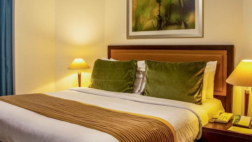The bedroom features a king-size premium quality bed, a second LCD TV with satellite channels, and a range of thoughtful amenities including a direct dial international telephone, in-room safe, wake-up service, iron and ironing board, hairdryer, and complimentary bottled water with tea and coffee-making facilities.