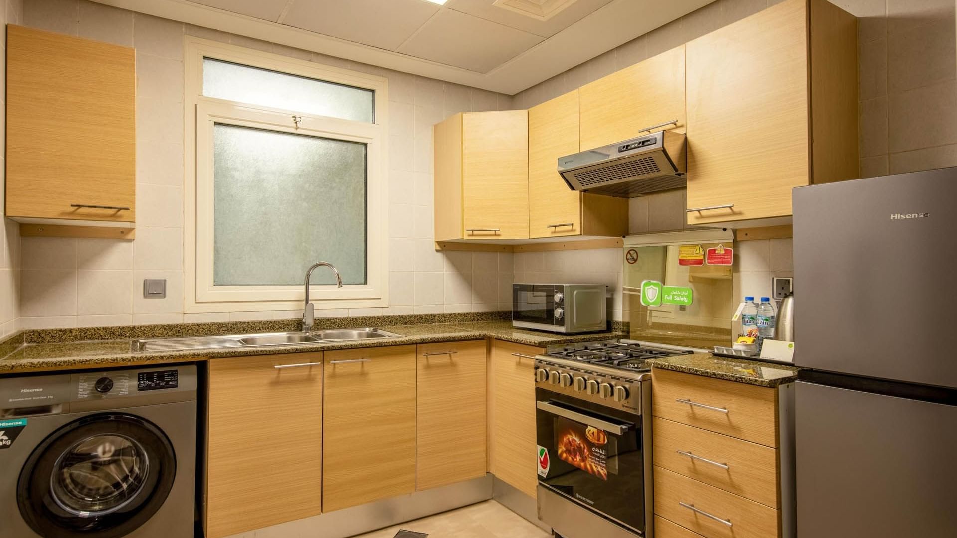 Step into a tastefully decorated space with modern yet elegant décor, and relax in the spacious separate living room, equipped with a 32” LCD TV and a wide range of satellite channels. A designated dining area and a fully equipped kitchen—including stove, oven, microwave, fridge freezer, electric kettle, and washer/dryer—provide all the essentials for a seamless extended stay.